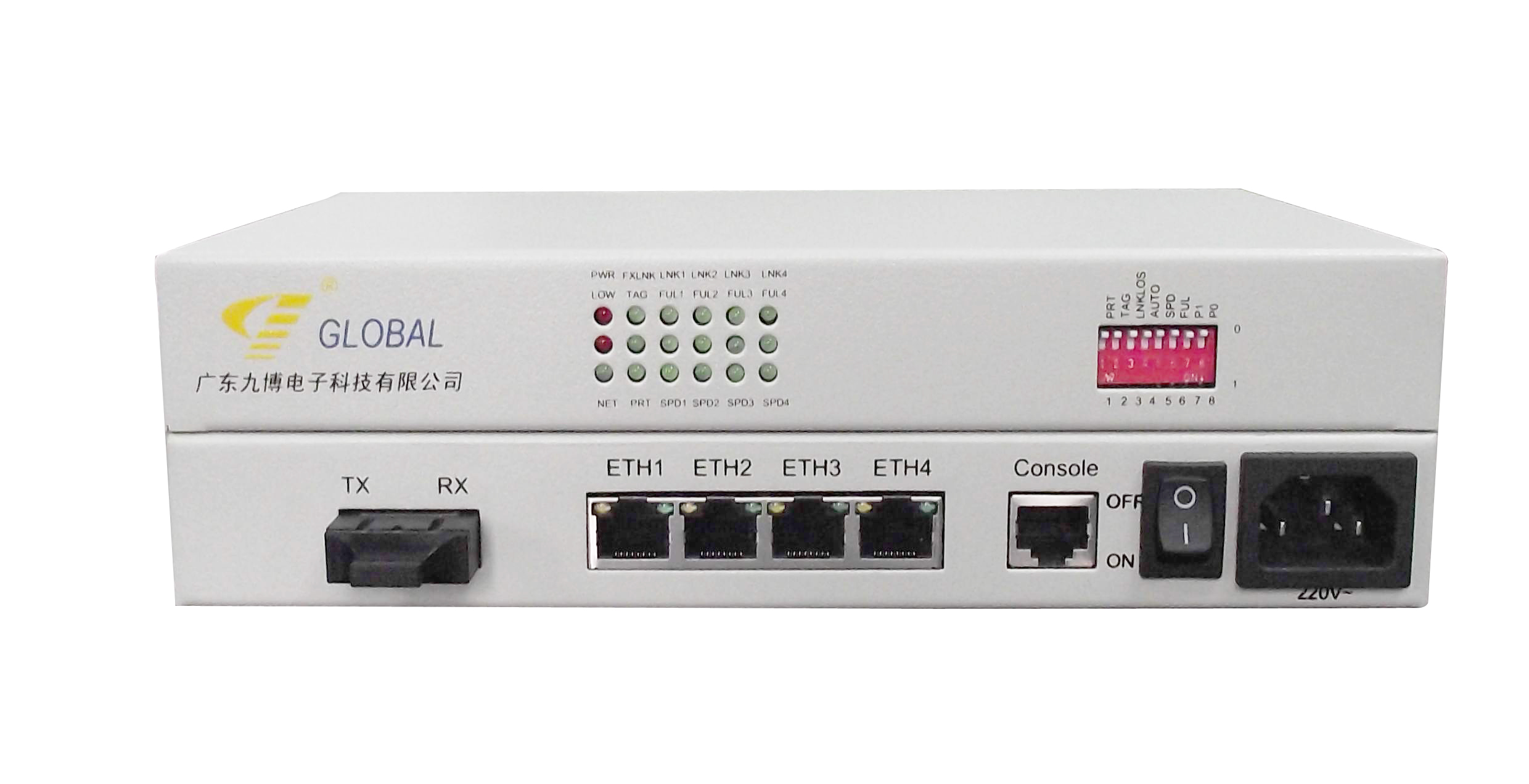 九博科技多电口光纤收发器,其中一个接口为光纤接口,通过此接口可以延伸本地局域网。其余N(N=1~16)个接口为10/100M以太网接口,各个交换接口能进行VLAN划分或共享,有两种类型的VLAN划分方式,一种为基于PORT的VLAN划分,另一种为基于802.1Q的VLAN划分。